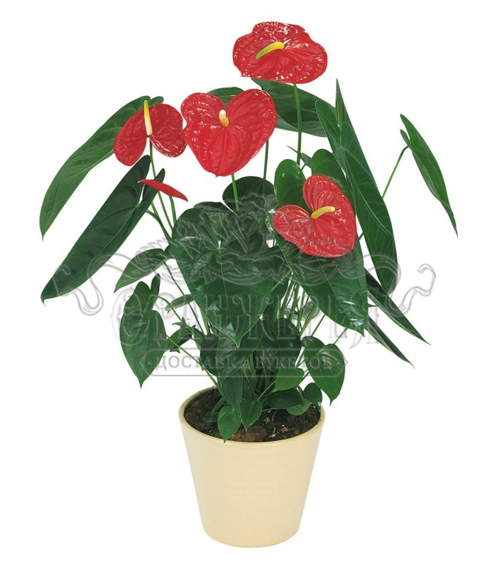 Мужским счастьем — в народе называют растение антуриум, поскольку данный цветок у нас принято преподносить в дар именно мужской половине человечества. Ведь считается, что цветы данного растения олицетворяют собой силу, храбрость, свободу и страсть.Листочки растения, окрашенные в тёмно-зелёный цвет, могут достигать длины до 40 см и обладают сердцевидной или стреловидной формой. Цветок выглядит, как початок белого, желтого или розового цвета, окруженный роскошным блестящим покрывалом, цвет которого может варьироваться от тёмно-красного до белого (иногда с пятнами). Форма покрывала напоминает собой стилизованную форму человеческого сердца.