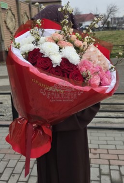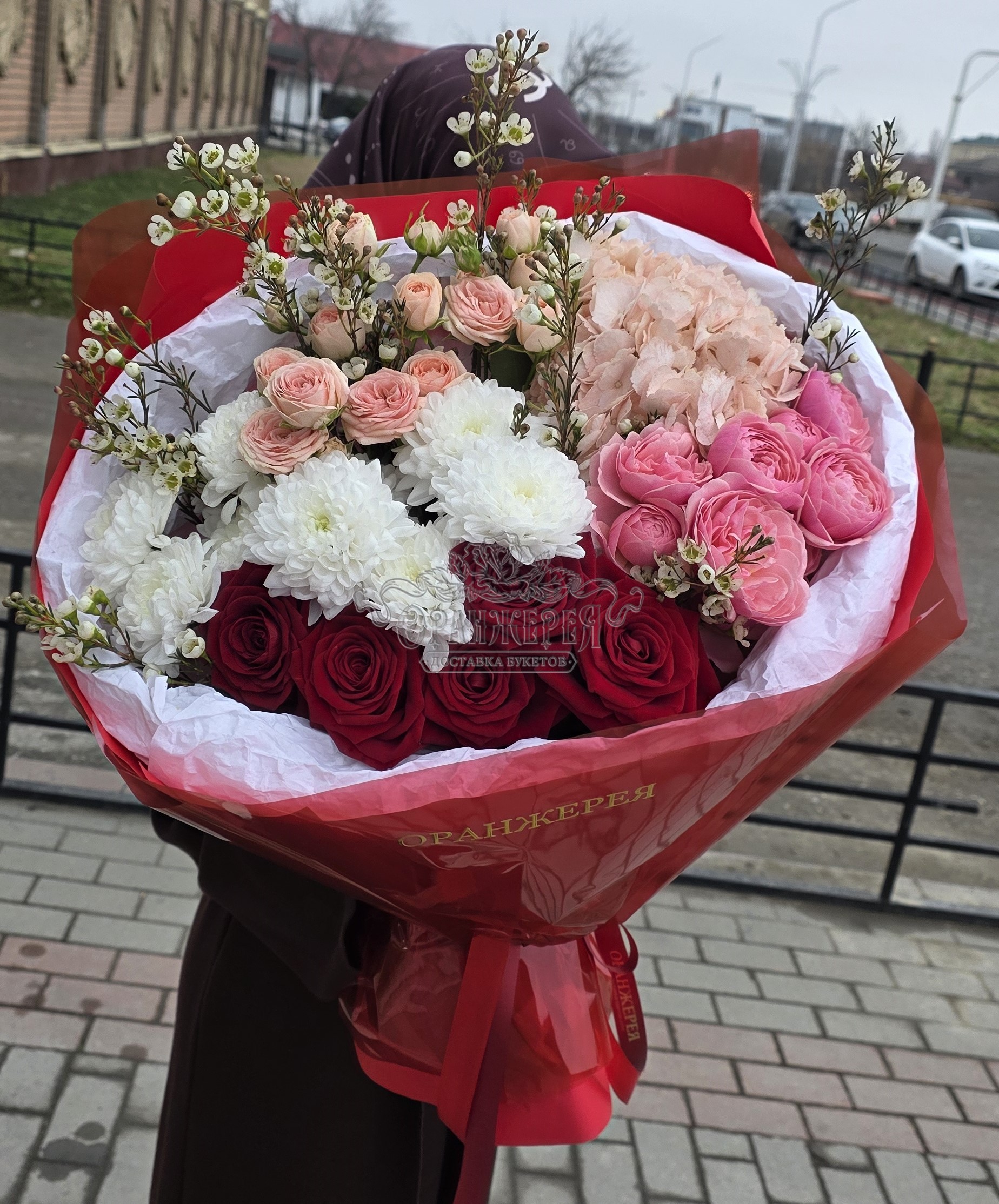 Рзы, гортензия, хризантема, кустовые розы, хамилациум, тройная упаковка, лента.