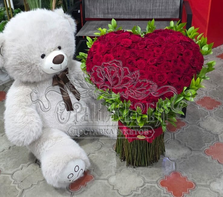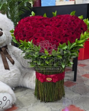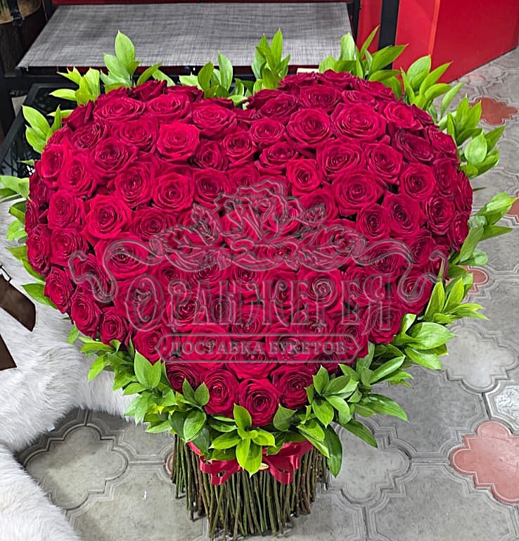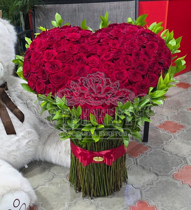 Розы, каркас, губка флористическая, рускус, бант атласный, бирка бренда.