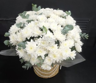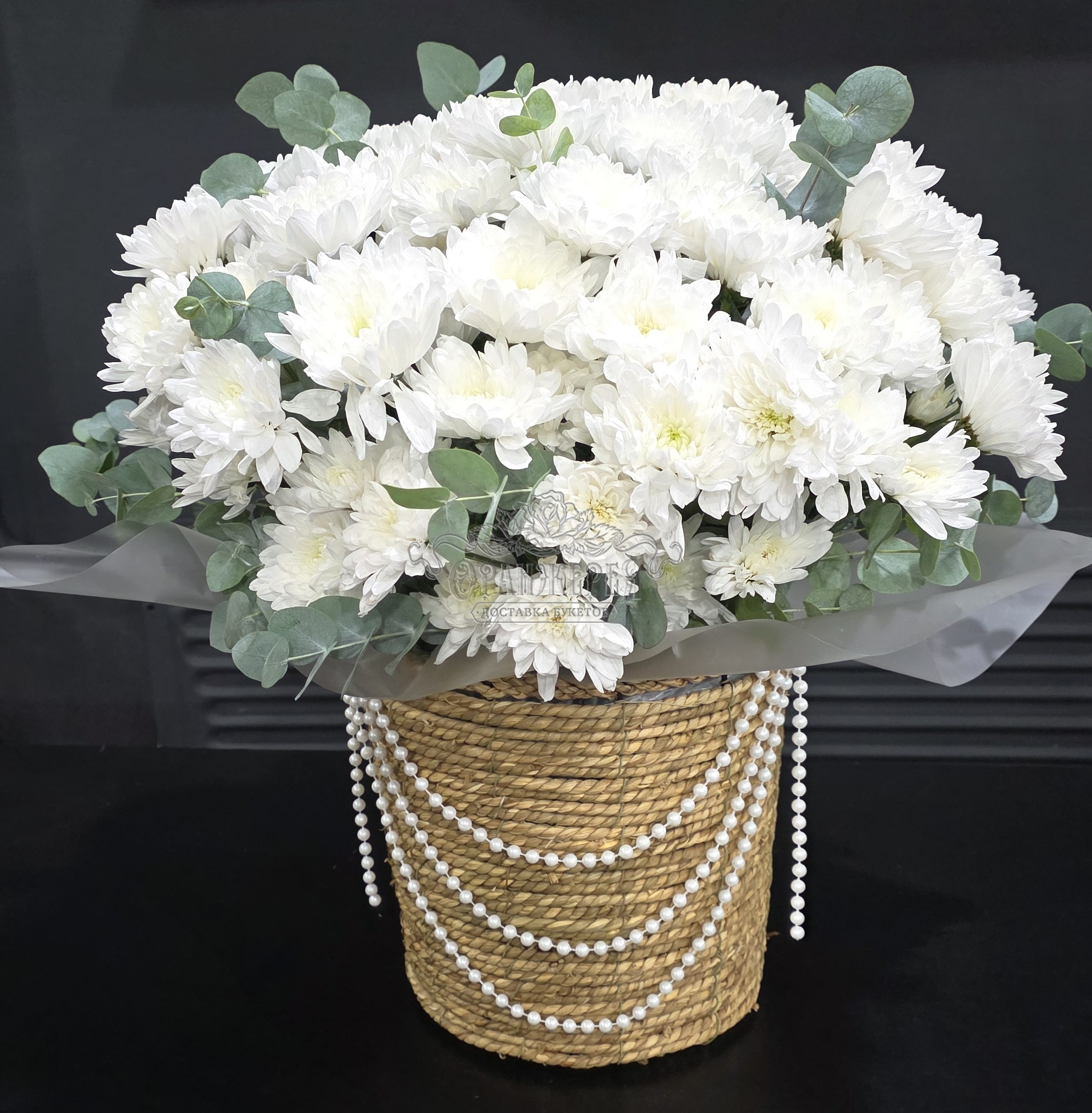 Хризантема кустовая, эвкалипт, корзина, нить жемчужная, губка флористическая
