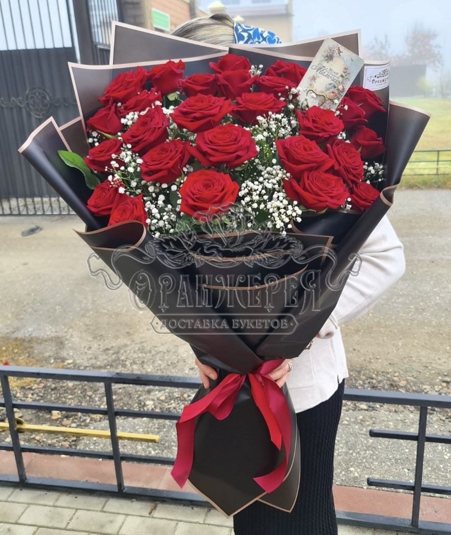 Розы, гипсофила, упаковка, лента.