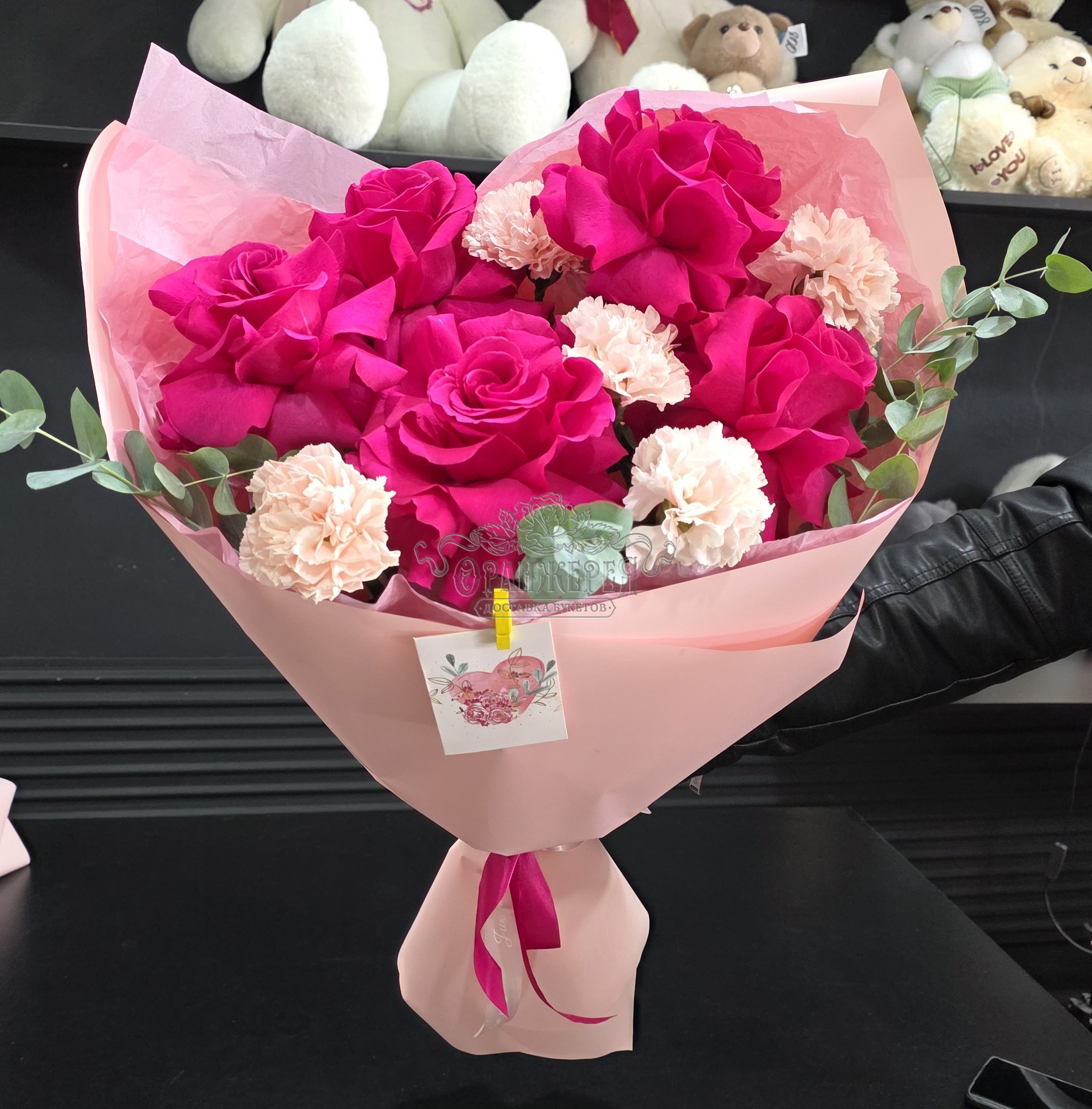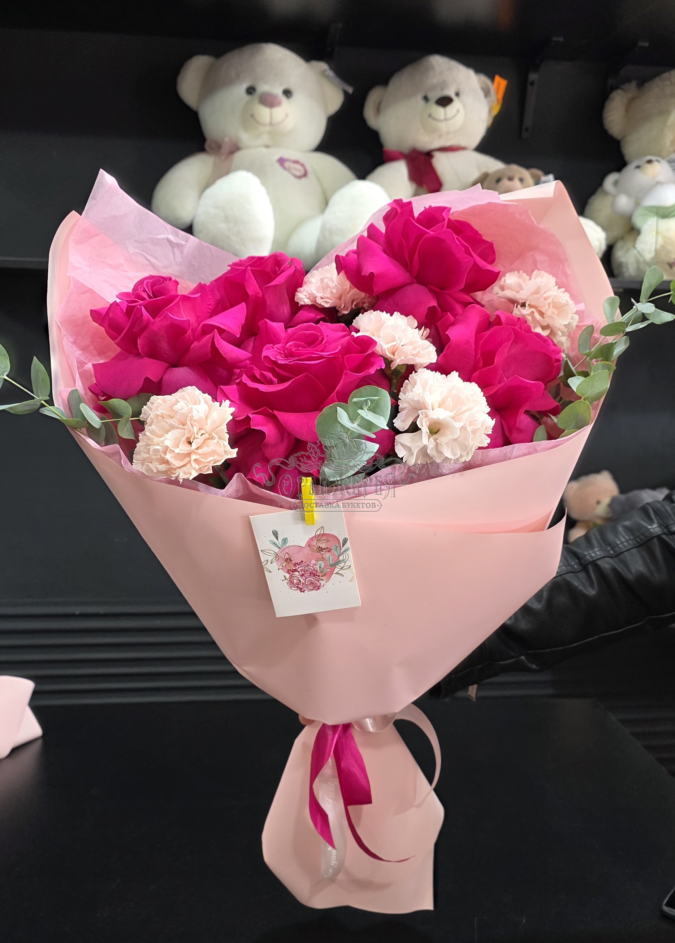 Розы, диантус, эвкалипт, упаковка, лента, открытка.