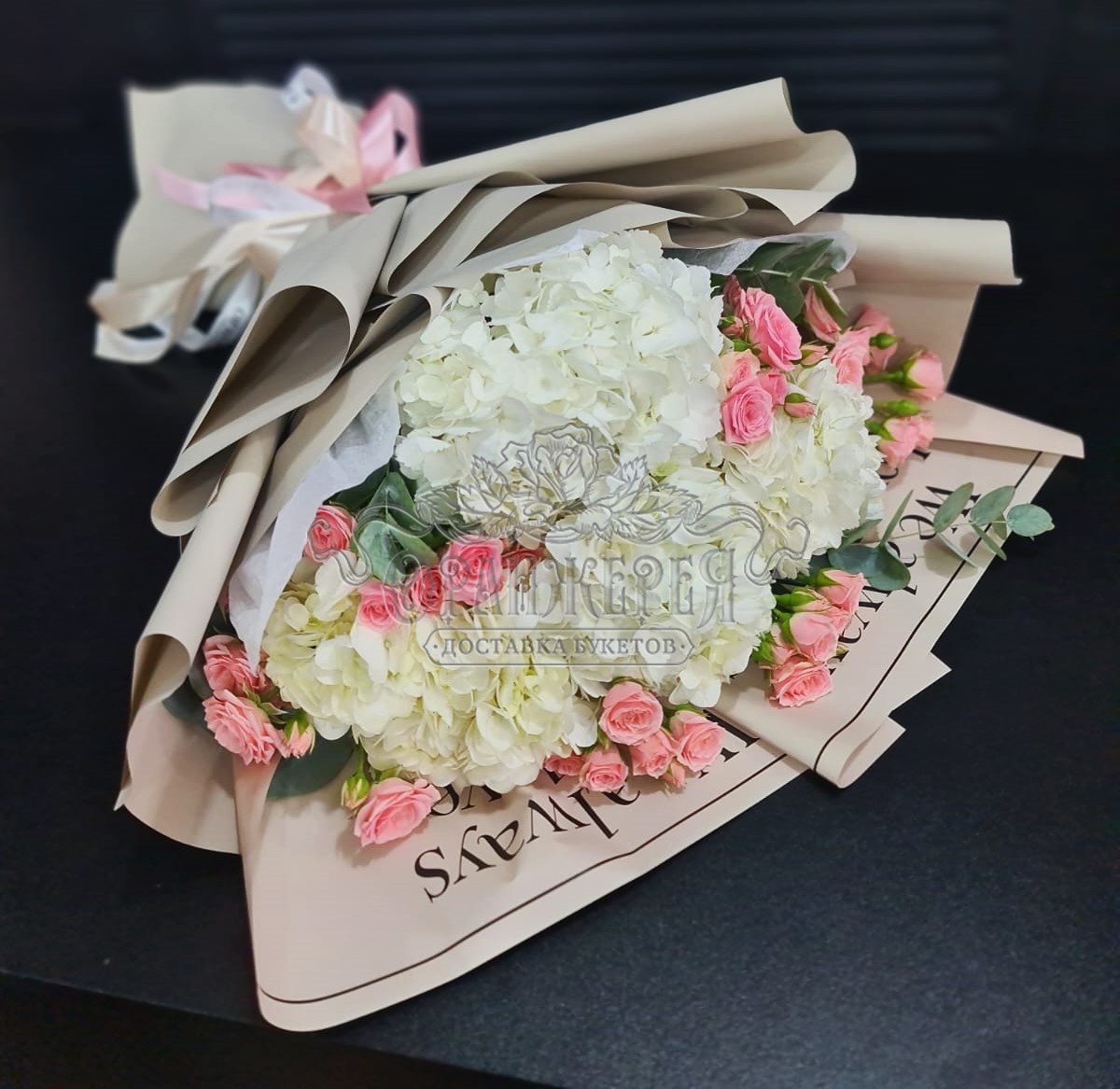 Гортензия 4 шт,розы кустовые 8 шт, эвкалипт, пленка матовая, лента атласная.