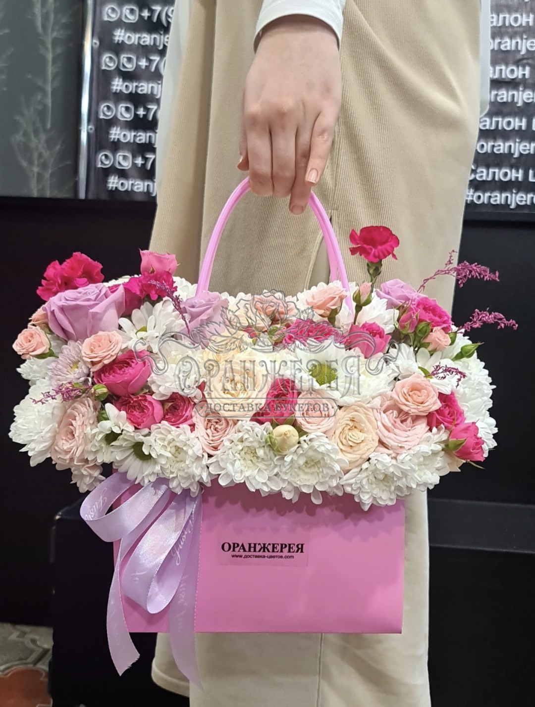 Розы, хризантема, кустовые розы, сумочка, губка флористическая, лента.